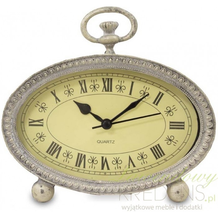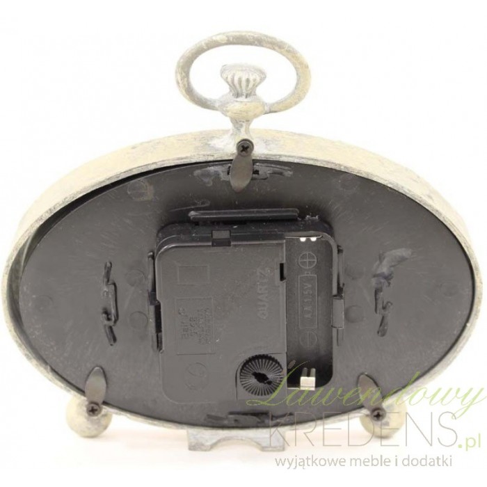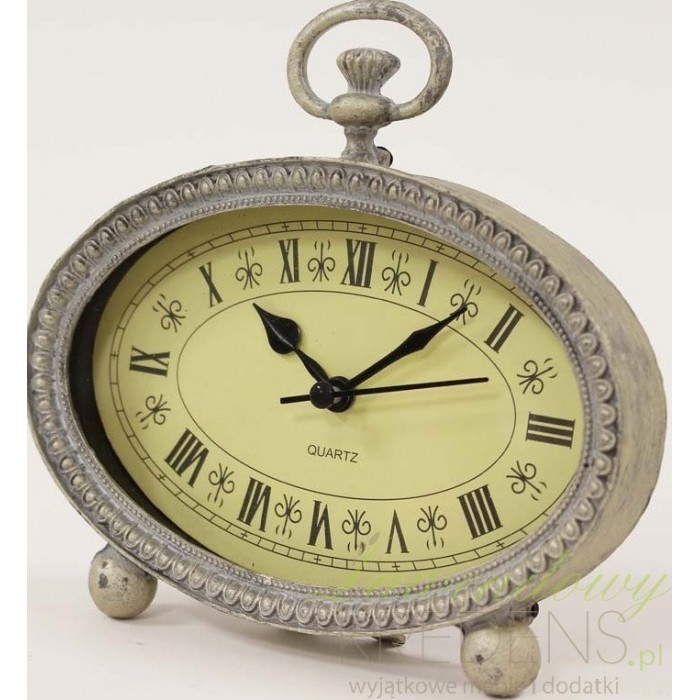 Zegar stołowy firmy Apl Dekoracje wykonany jest z dobrej jakości metalu i szkła. Ma świetny beżowy kolor, który jest mocno przecierany. Stojący zegar ma fantastyczny owalny kształt i delikatną, acz wspaniałą dekorację naokoło tarczy.