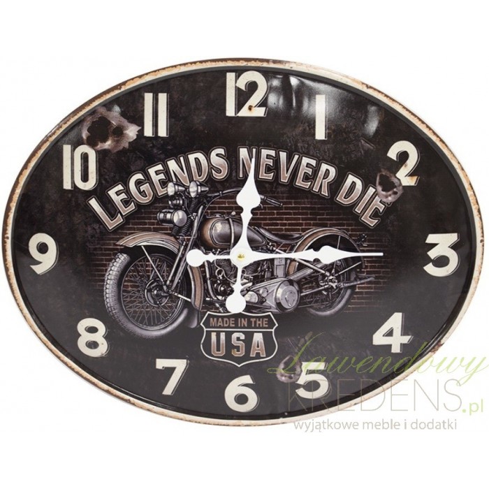 Zegar w czarnym klolorze o owalnym kształcie z charakterystycznym nadrukiem motocykla i angielską sentencją.