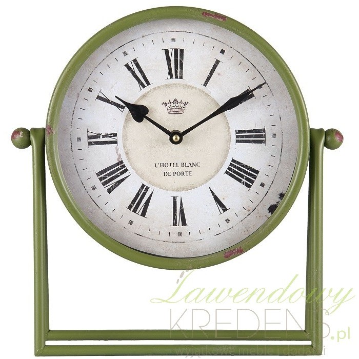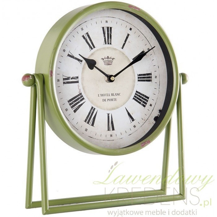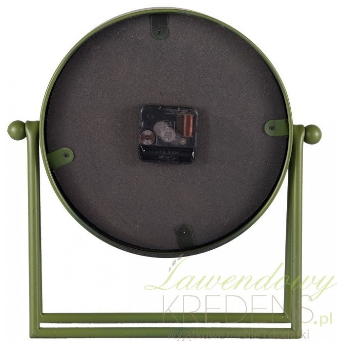 Metalowy zegar w kolorze zieleni z domieszką delikatnych, rdzawych przetarć. Okrągła, biała tarcza zegara z czarnymi wskazówkami zamocowana została do podwójnych, smukłych nóżek. To zestawienie antycznego stylu z oryginalnym kształtem, które wydaje się być idealną dekoracją do wesołego wnętrza. Ustawiony na komodzie w nowoczesnym wnętrzu podkreśli nieformalna atmosferę i ożywi wnętrze, a w antycznym klimacie będzie współgrał z innymi dodatkami.