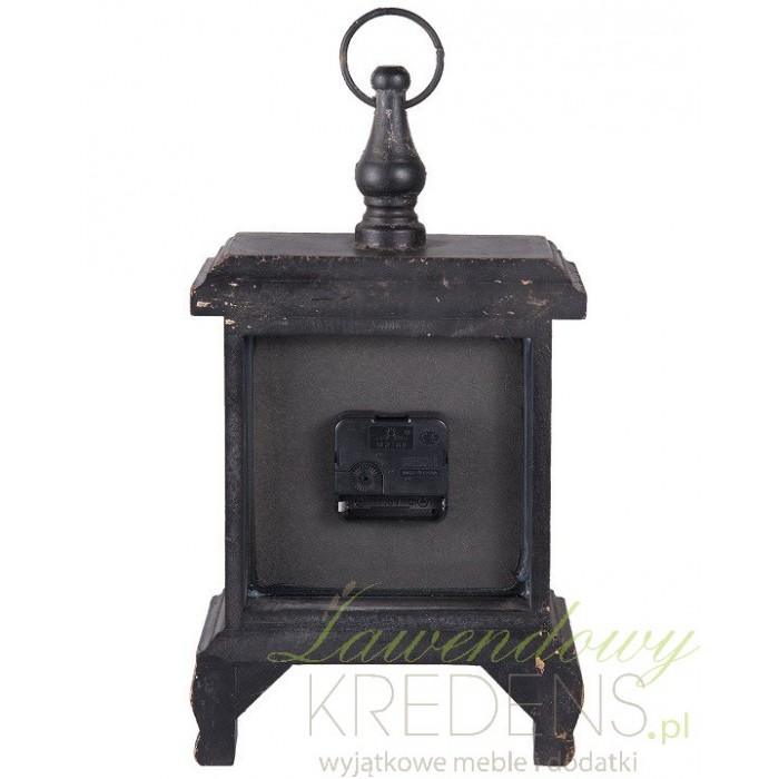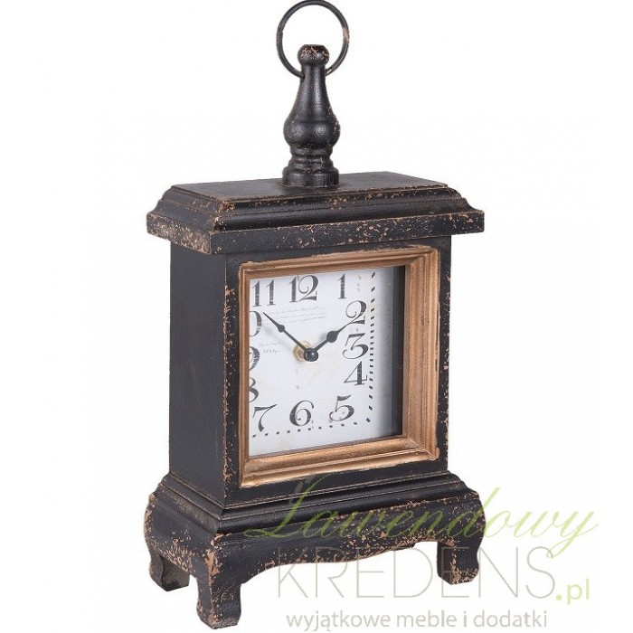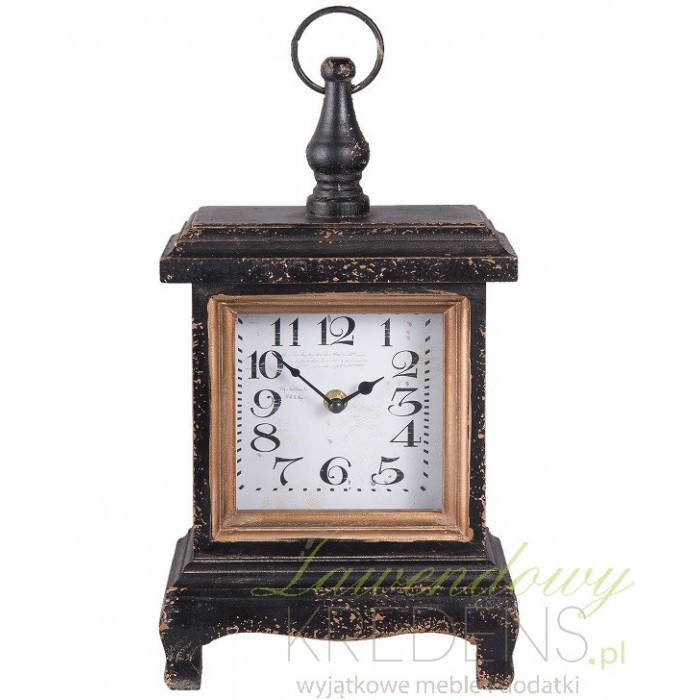 Postarzany zegar stołowy w czarno-złotym kolorze wygląda na pierwszy rzut oka na magiczny przedmiot.