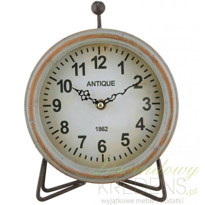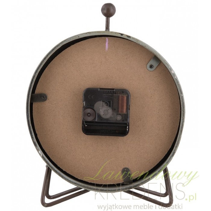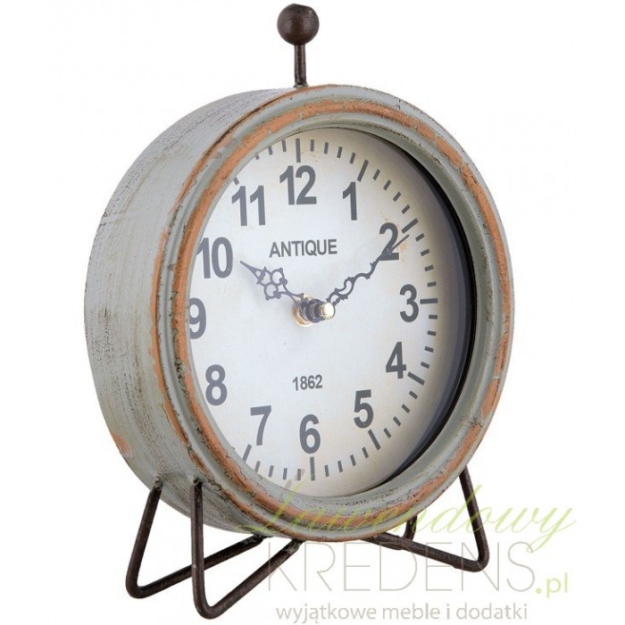 Zegarek stołowy w stylu prowansalskim to metalowy czasomierz ustawiony na czterech nóżkach wygiętych w kształt trójkata. Zegarek, którego szara barwa jest urozmaicona przetarciami sprawdzi się świetnie we wnętrzach w stylu prowansalskim i antycznym, ale urozmaici tez klimat wnętrz nowoczesnych. Zegarek z okrągłą tarczą nie tylko będzie ozdobą ale też praktycznym elementem wyposażenia wnętrza. Urządź z nami swoje wymarzone wnętrze i wybierz dla siebie idealny zegarek!