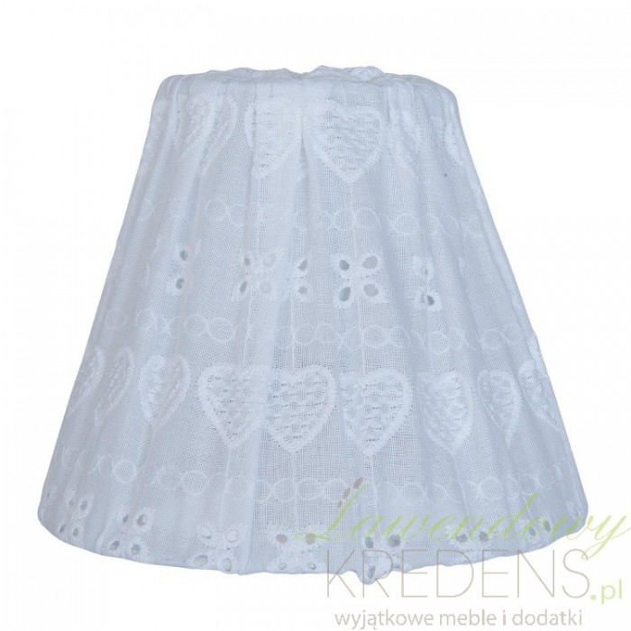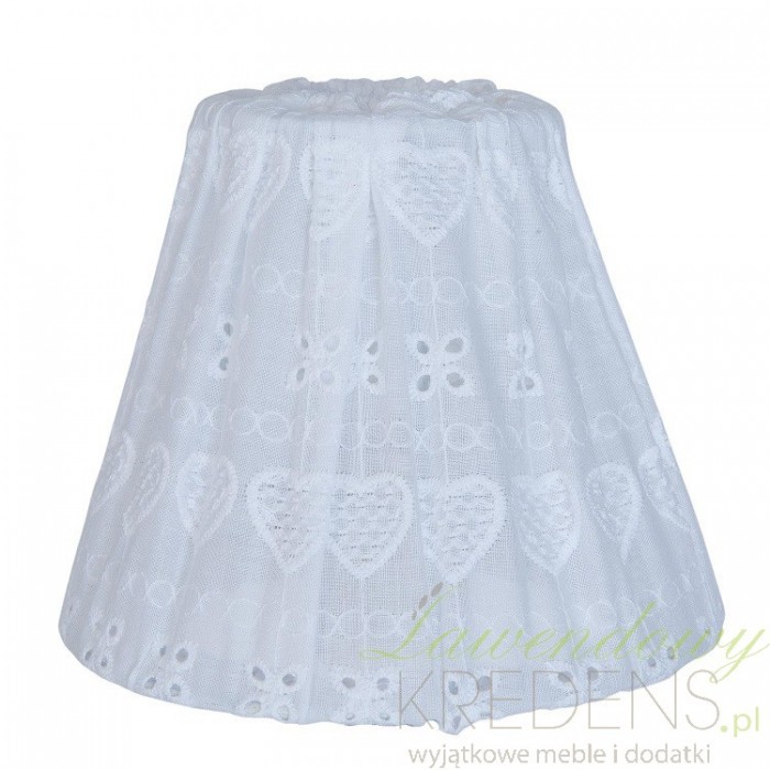 Kolekcja materiałowych abażurów to istotny element aranżacji wnętrza, który kreuje przestrzeń wokół nas nastrojową i ciepłą. Jeżeli często spędzasz wieczory czytając książkę przy lampce nocnej bądź podłogowej - polecamy Ci koronkowy abażur z bawełny w białym kolorze. Abażur z wzorem w serca będzie pasował na każdą lampkę drewnianą lub metalową o rozmiarze gwintu E27. Kameralne światło i romantycznie zaaranżowane wnętrze to tylko kilka powodów, dla których warto mieć w swoim domu prezentowany abażur.