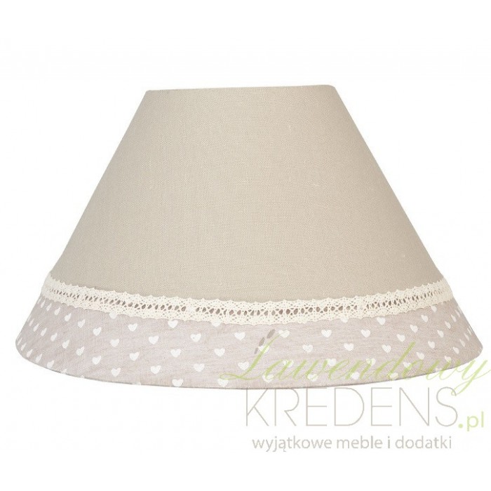 Abażur w stylu prowansalskim w stosowanym kolorze beżu został wykonany z bawełny. Dolna krawędź abażuru została ozdobiona paskiem materiału w groszki i koronka. Dzięki takiej dekoracji uzyskasz naturalne, ciepłe oświetlenie sypialni lub pokoju dziecięcego. Abażur o klasycznym kształcie sprawdzi się z każdym rodzajem nogi i będzie zachęcał do relaksu w bardzo przyjemnej atmosferze.