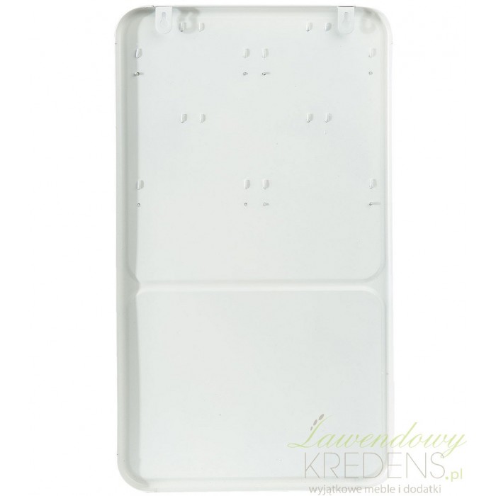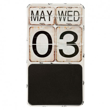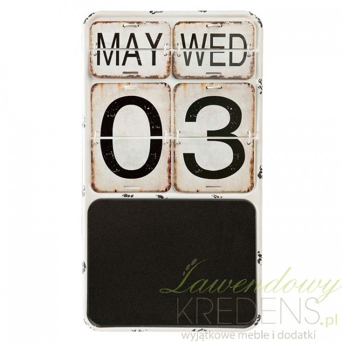 Metalowy kalendarz retro to oryginalnie postarzana dekoracja do zawieszenia na ścianie. Kalendarz wyposażony został w tabliczki oznaczone liczbami i nazwami dni miesiąca i tygodnia. Pod tabliczkami znajduje się czarna tabliczka do zapisywania notatek kredą, dzięki której nie umknie Ci żadne ważne wydarzenie. Prostokątny kalendarz ma biały kolor, na którym widoczne są rdzawe przebarwienia, w szczególności widoczne dookoła tabliczek. Jeżeli szukasz kalendarza, a jednocześnie chcesz ozdobić swoje biuro lub ścianę w pokoju - kalendarz retro jest dla Ciebie!