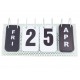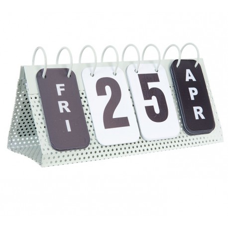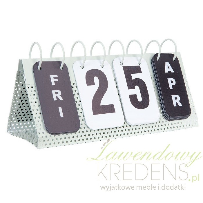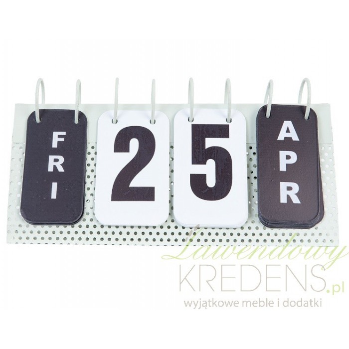 Metalowy kalendarz stojący na biurko z poziomym ukałdem tabliczek. Czarne tabliczki zostały oznaczone angielskimi skrótami nazw miesięcy i dni tygodnia, a białe oznaczają kolejne dni miesiąca. Zostały one zamocowane do ażurowego stelaża za pomoca metalowych kółek. Kalendarz w stylu retro będzie służył Ci przez wiele lat na biurku w pracy lub w gabinecie, ale może też być świetną niepsodzianką dla przyjaciela.