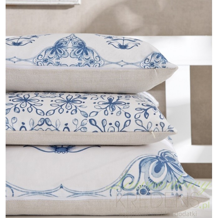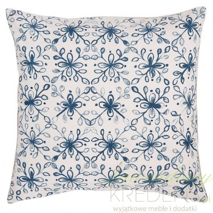 Ozdobna poszewka na poduszkę z granatowym wzorem kwiatowym wykonanym na białym tle. Poduszka ubrana w poszewkę prowansalską wypełni puste miejsce na fotelu w salonie lub kanapie, dodając tym meblom oryginalności. Fantazyjne wykończenie dekoracyjnej strony poszewki to bardzo modne i praktyczne rozwiązanie, które pozwoli za pomoca niewielkiego dodatku znacznie zmienić wyraz całego wnętrza. Nie zwlekaj i zaopatrz sie w komplet wzorzystych poszewek, a od razu poczujesz ich magię!