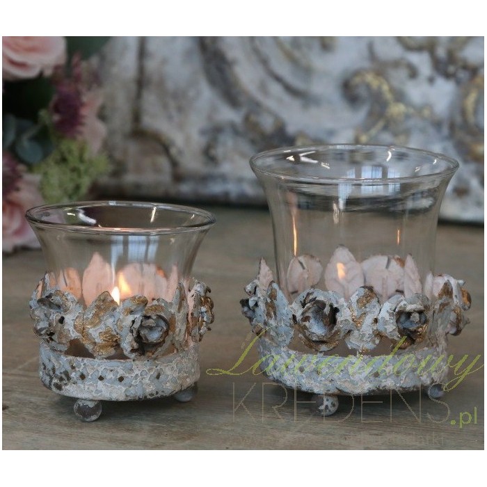 Postarzany świecznik na świecę typu tealight może stanowić element oświetlenia lub dekoracji. Otoczony metalową, lekko pobieloną osłonka prezentuje się wyjątkowo na stole lub komodzie. Metalowa osłonka to jednocześnie podstawa Świecznika, która zapewnia podstawę całości dekoracji. Zaopatrz się w zestaw świeczników z kwiatowymi elementami, niech zdobią Twoje wnętrze przez cały rok!