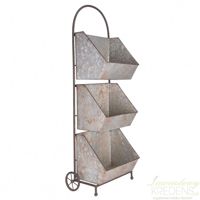 Kwietnik w stylu prowansalskim przypomina kształtem wózek, ponieważ do dwóch tylnych nóg przymocowano mu kółeczka, a w górnej części wykonano półokrągły uchwyt. Trzy szare pojemniki z rdzawymi i białymi przbarwieniami stanowią główny element zdobniczy wózka, a przednie nóżki zapewniają oparcie kwiatowej dekoracji. Wysoki na 96cm kwietnik może stać się jedną z głównych ozdób w Twoim pięknym ogrodzie lub na balkonie. Jeżeli marzysz o dekoracji, która zajmując niewiele miejsca wprowadzi duże zmiany zdecyduj się na dodatki w stylu prowansalskim!
