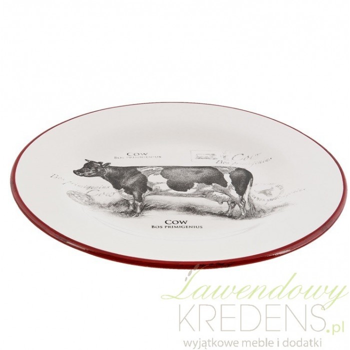 Talerz prowansalski wykonany z białej ceramiki posiada ozdobną obwódkę w czerwonym kolorze. Grafika krowy na samym środku tego talerza to dodatkowy element dekoracyjny. Talerze w stylu prowanslskim to prawdziwe dzieła sztuki, przy których każdy posiłek smakuje nadzwyczaj dobrze.