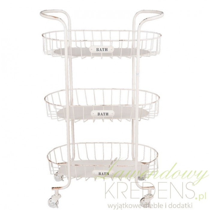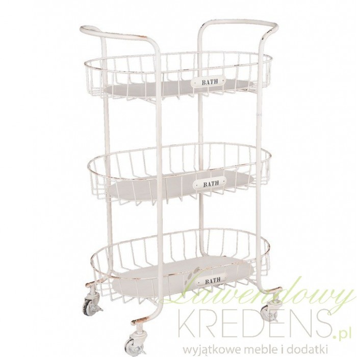 Półki łazienkowe na kółkach to trzypoziomowy mebel wykonany z metalu. Każda z półek posiada obrzeże w formie metalowych pręcików oraz zdobienie w postaci tabliczek z czarnym napisem "BATH". Zamocowane przy podstawie stojaka kółka umożliwiają dowolne przestawianie półki w bardzo prosty sposób. Półki do łazienki to elementy wyposażenia, które przede wszystkim sprawiają, że wnętrze staje się bardziej funkcjonalne ale nabiera też pięknego wyglądu. Wybierz półki na kółkach, niech zaprowadzą porządek w Twojej łazience lub toalecie.