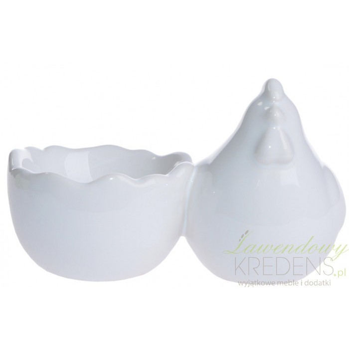 Biały, ceramiczny kieliszek do jajek pochodzenia holenderskiego z dekoracyjną dużą kurą u boku!