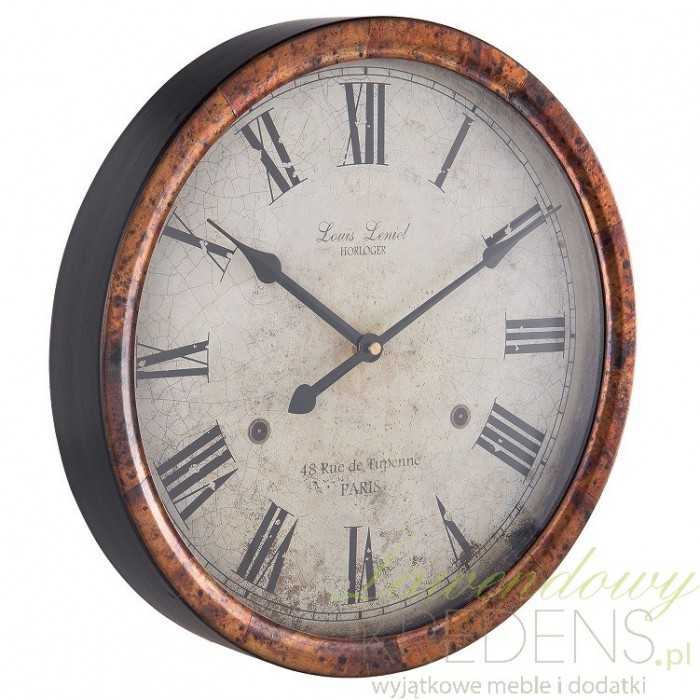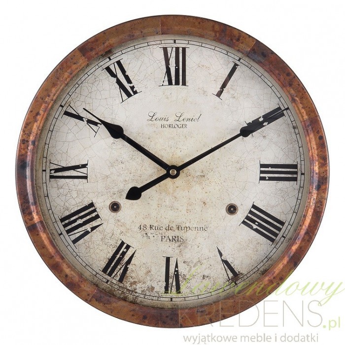 Metalowy zegar prowansalski wygląda na bardzo stary, ma ramę w miedzianym kolorze, na której dostrzeżesz ciemne plamki i inne postarzenia.