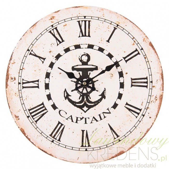 Zegar marynistyczny z nadrukiem na tarczy przedstawiającym kotwicę i napis Captain niewątpliwie jest dodatkiem zainspirowanym morskim klimatem. Okrągły zegar do zawieszenia na ścianie.