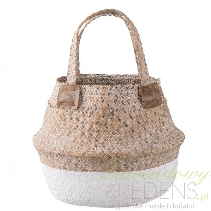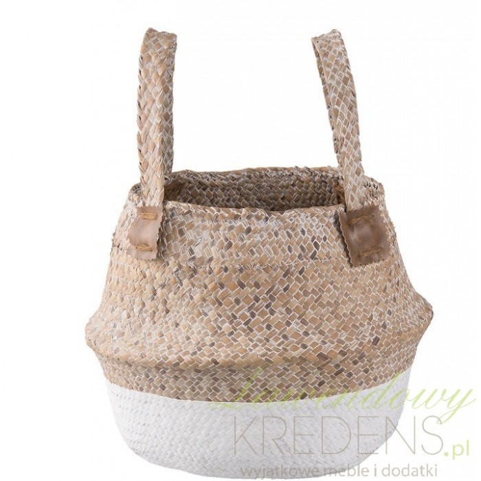 Pleciony kosz z dwoma uchwytami w kolorze biało-brązowym. Oryginalny kosz z trawy morskiej, który może mieć wielorakie zastosowanie, ponieważ sprawdzi się zarówno na kwiaty, poduszki lub inne gadżety. Kosz ozdobny to hit tego sezonu! Takim dodatkiem możesz w ciekawy sposób udekorować przestrzeń. Idealnie sprawdzi się do wielu aranżacji.