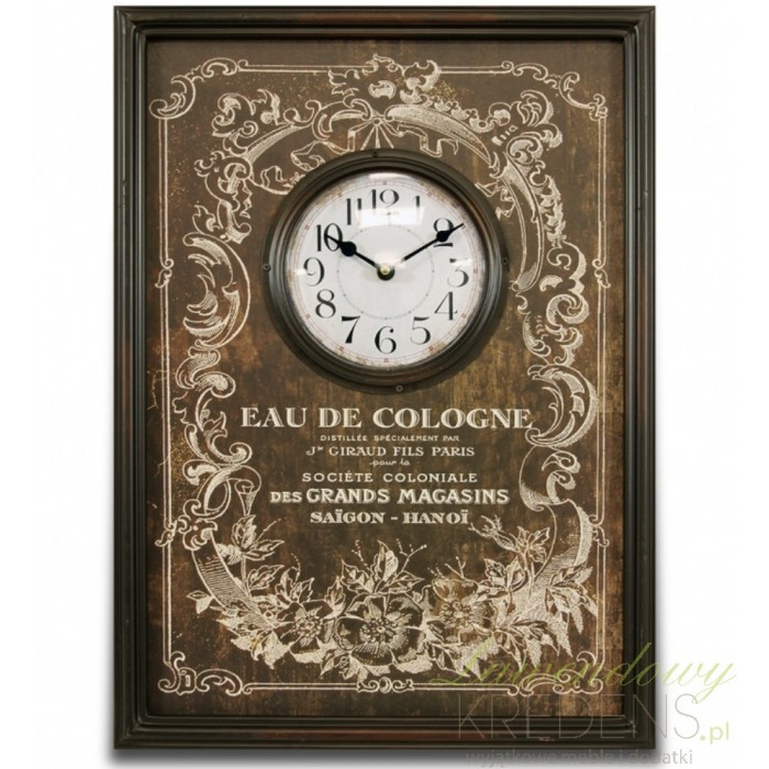 Zdobiony licznymi wzorami francuskimi zegar retro ma kształt dużego prostokąta o wysokości ponad 50cm.