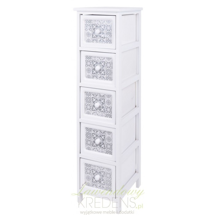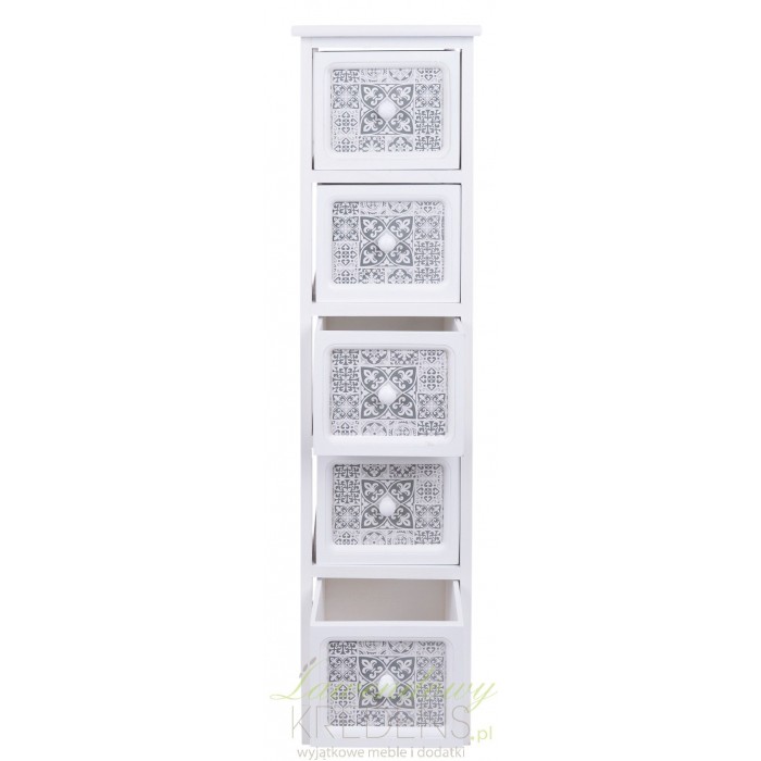 Biała szafka prowansalska od holenderskiej marki to połączenie praktyczności z intrygującym wzornictwem. Proponujemy Ci wysoką i zgrabną szafkę z pięcioma wysuwanymi szufladami. Na frontach każdej z nich wykonano ciekawy wzór i zamontowano białą gałkę. Naszą misja jest dbanie o bogatą ofertę niepowtarzalnych mebli i dodatków z dusza, które wspólnie tworzą piękne i funkcjonalne wnętrza.