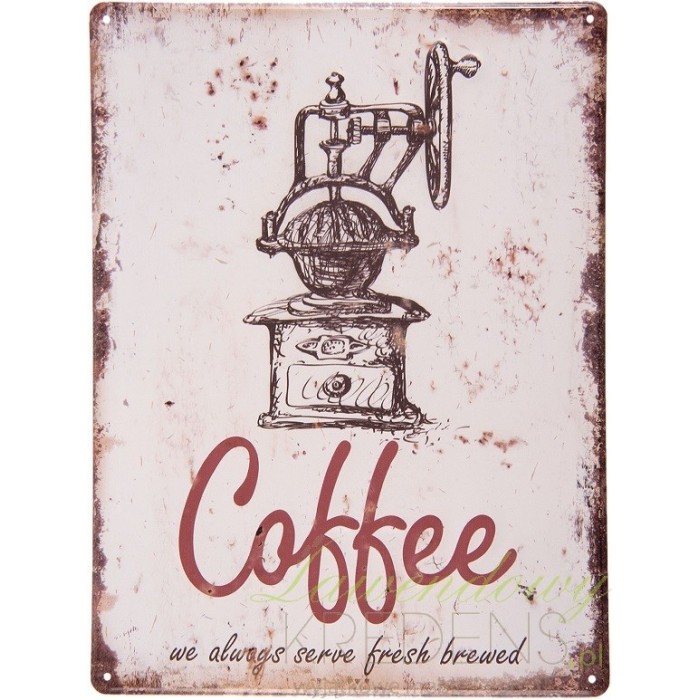 Tabliczka Vintage łączy w sobie różne inspiracje stylistyczne. Wykonana z metalu pasuje do dekoracji wnętrz loftowych, a widoczne postarzenia świetnie odnajdą się w wysmakowanych, antycznych pomieszczeniach. Dlatego też tabliczka metalowa z grafiką przedstawiającą młynek do kawy oraz angielski napis "Coffee" odnajdzie się wśród wielu aranżacji od surowych wnętrz fabrycznych po klimatyczne wnętrza francuskie. Nie zwlekaj i zamów zestaw tabliczek, które zamocowane na ścianie zatroszczą się o radosny klimat.