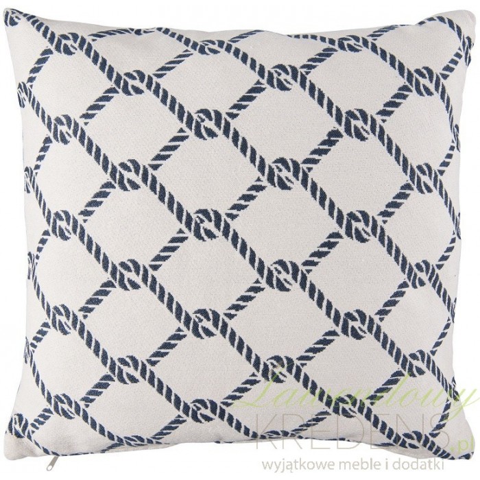 Biała poduszka marynistyczna z granatowym wzorem ze splecionej liny uszyta jest z bawełny. Miękka i solidnie obszyta może być wykorzystana także jako element wyposażenia i dekoracji w nadmorskiej knajpie lub na jachcie. Sam zdecyduj jakie poduszki w stylu marynistycznym najlepiej podkreślą charakter Twojego lokalu bądź wnętrza. U nas czeka na Ciebie niezliczona ilość dodatków w stylu marynistycznym.