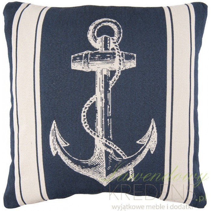 Poduszka marynistyczna ozdobiona została grafiką przedstawiającą kotwicę, która znajduje się na froncie poduszki pomiędzy dwoma jasnymi pasami. Dzięki takiej dekoracji poduszka nawiązuje do klimatycznych, nadmorskich miejsc. Kwadratowa poduszka sprawdzi się idealnie jako ozdoba wnętrza, akcentująca żeglarskie zamiłowania. Poduszki w stylu marynistycznym to również niezbędny dodatek, o którym nie można zapomnieć urządzając nadmorski pensjonat lub domek letniskowy.
