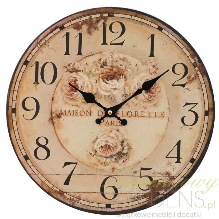 Zegar w stylu prowansalskim posiadający średnicę tarczy 34cm, która posiada lekko pożółkły kolor co dodaje jej postarzanego klimatu. Jest to zegar z różami co dodatkowo podkreśla jego styl ponieważ kwiaty to jeden z głównych motywów jeśli chodzi o zegary w stylu prowansalskim.