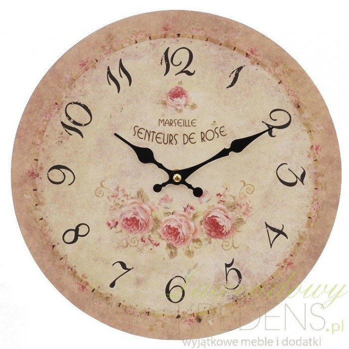 Zegar w stylu prowansalskim, który posiada lekko różowawy kolor, finezyjne czarne cyfry a także u dołu trzy różowe róże, zaś na górze jedną. Zegary w stylu prowansalskim bardzo lubią być zdobione napisami, więc tutaj też ich nie mogło zabraknąć. Zegar z różami to genialny pomysł na każdą ścianę.