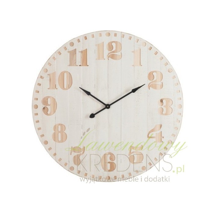 Duży zegar z kolekcji Rustic wykonany jest z doskonałej jakości wytrzymałego drewna. Ma śliczny biały kolor, okrągły kształt i złote duże arabskie cyfry. Wskazówki zegara są czarne, dzięki czemu doskonale kontrastują z całością. Zegary ścienne, a wśród nich duże zegary to cudowna ozdoba ściany oraz mieszkania.