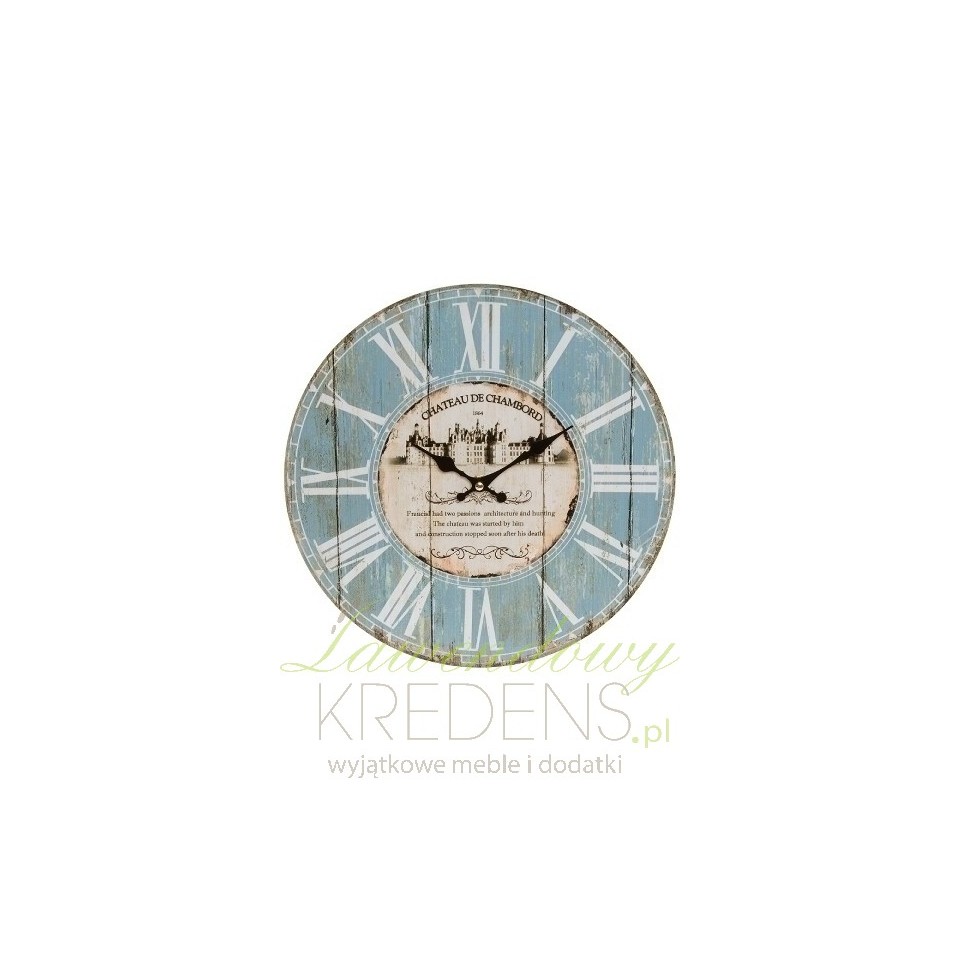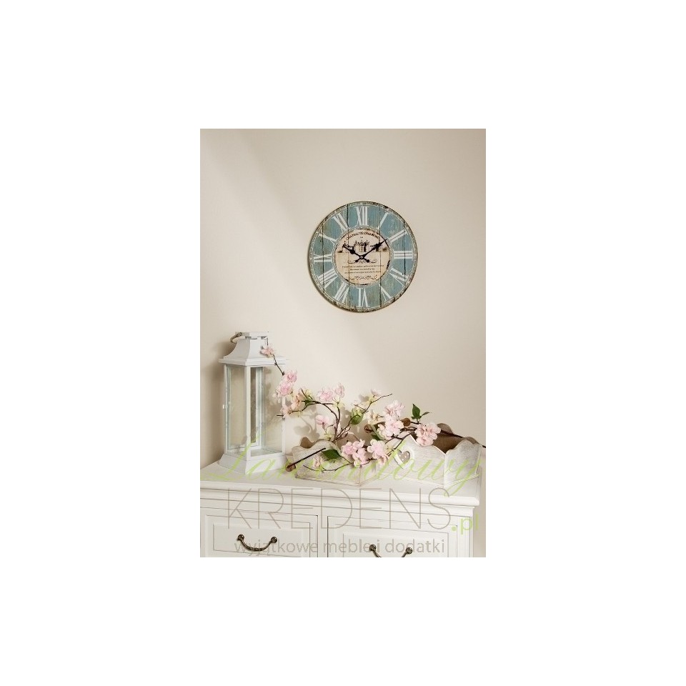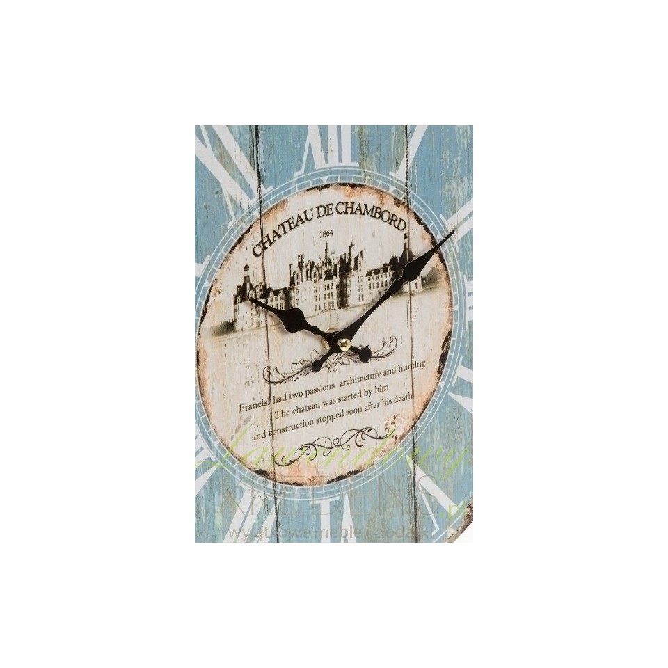 Zegar w stylu francuskim w kształcie koła jest przeznaczony do zawieszenia na ścianie. Nacechowany postarzeniami przypomina stary, antyczny zegar. Na jego tarczy wykonano grafikę przedstawiająca zamek oraz napisy, wokół których roztacza się niebieski okrąg z białymi cyframi rzymskim. Do złudzenia przypominający drewniany, zegar w stylu francuskim jest dodatkiem, który poza tym, że przyprawia wnętrze odrobiną antycznego stylu dodatkowo działa bez zarzutu i zawsze wskazuje odpowiednią godzinę.