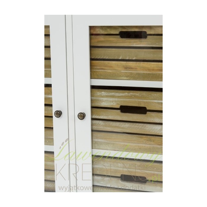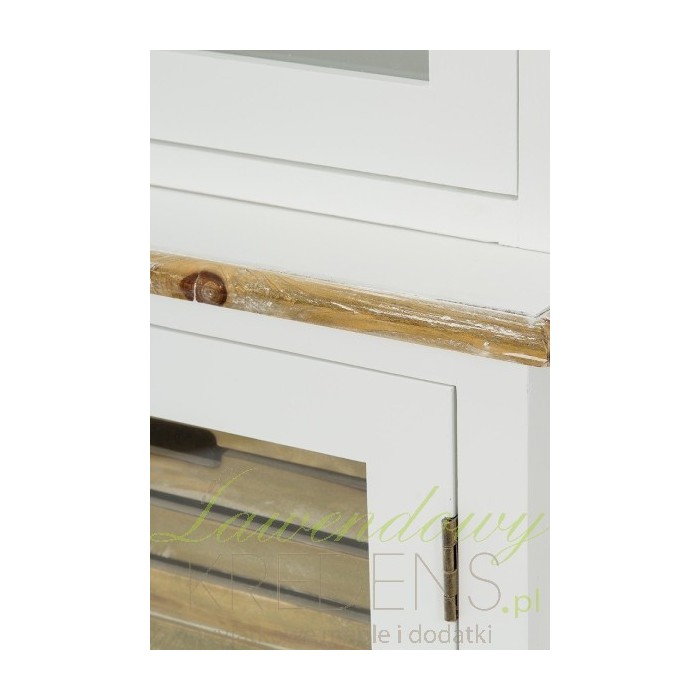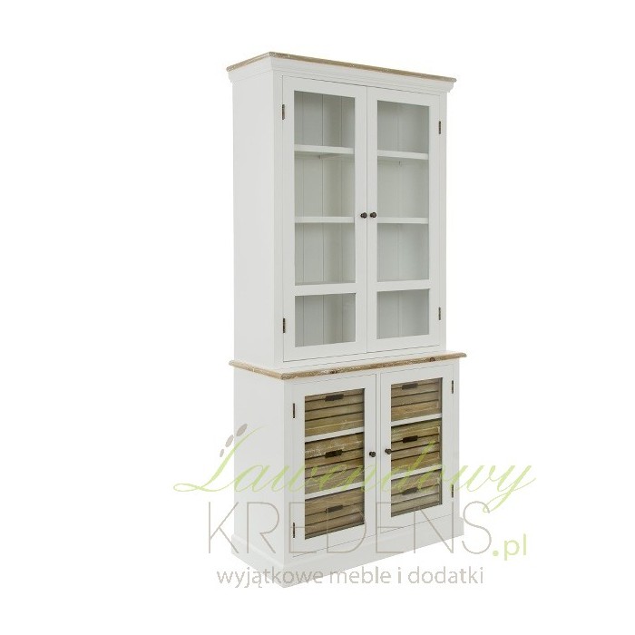 Wysoki i szeroki kredens prowansalski to mebel wykonany na miarę każdej kuchni prowansalskiej. Mając w swojej kuchni tak praktyczny mebel nigdy nie będziesz już martwił się o przechowywanie porcelany, książek kucharskich i innych akcesoriów. Kredens w stylu prowansalskim jest biały, ma dwie przeszklone szafki, u góry znajdują się półki, a u dołu drewniane kosze w kolorze brązowym. Zamów meble prowansalskie z kolekcji Riviera aby kuchnia była nie tylko funkcjonalna ale również praktyczna!