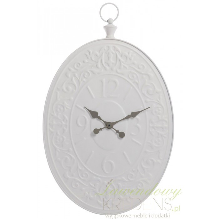 Zegar prowansalski, na którym cyfry oznaczające godziny zostały oznaczone przez wypukłosci wykonane na metalowej tarczy. Owalny zegar z szarymi wskazówkami to typowo dekoracyjna ozdobą ściany w kolorze bieli. Duży zegar jest dodatkiem, który zawieszony na ścianie robi niesamowity efekt. Wykorzystaj zegary w stylu prowansalskim aby podkreślić jak bardzo ważną rolę w codziennym życiu odgrywa nastrój panujący w Twoim wnętrzu i każdy detal się w nim znajdujący.