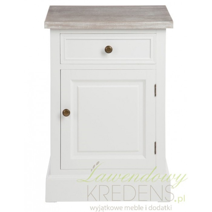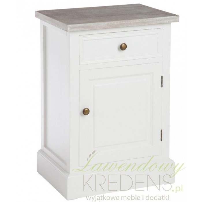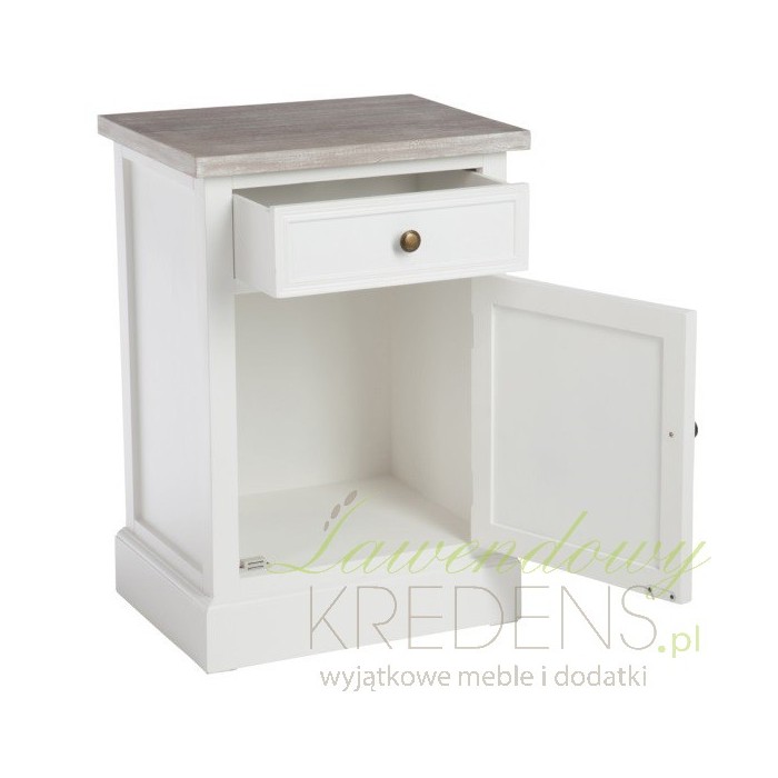 Elegancka szafka nocna w wyposażona jest w szufladkę oraz szafkę, a jej zwieńczenie stanowi jasnobrązowy blat w stylu francuskim.