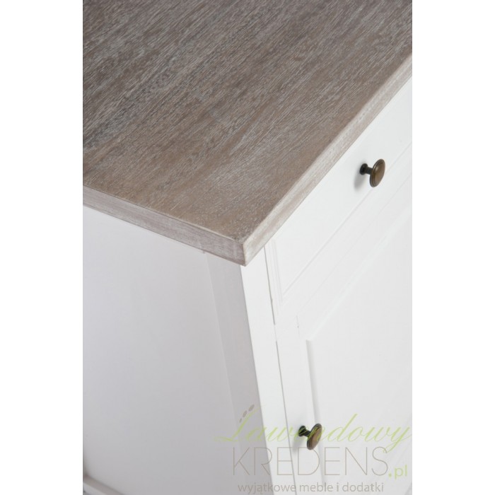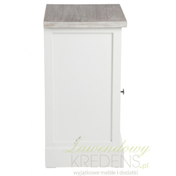 Szafki nocne Mondi to meble wykonane z drewna, utrzymane w kolorze bieli. Elementem wyróżniającym mebel jest prostokątny blat w brązowym kolorze wzbogacony bieleniami. Pojedynczą szufladkę i zamykana szafkę zdobią metalowe gałki. Szafka nocna została stabilnie wsparta na masywnej podstawie i zasługuje na szczególną uwagę osób, które cenią funkcjonalne meble prowansalskie.