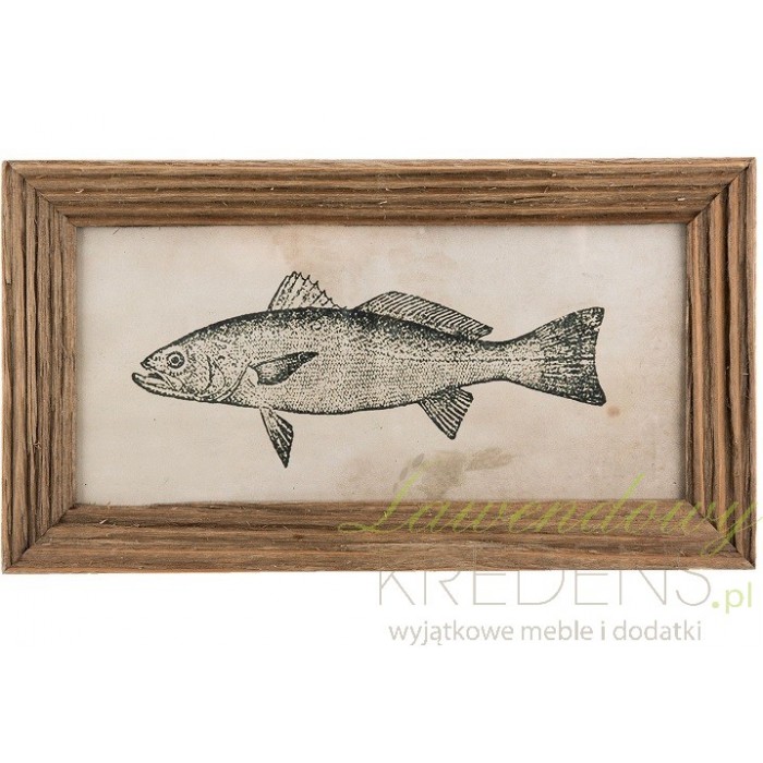Prostokątny obrazek z rybą, posiada brązową ramę oraz postarzane, jasne tło na którym widoczna jest czarna grafika ryby. Obrazki z rybą to genialne dekoracje na przykład do łazienki lub też innego pomieszczenia.
