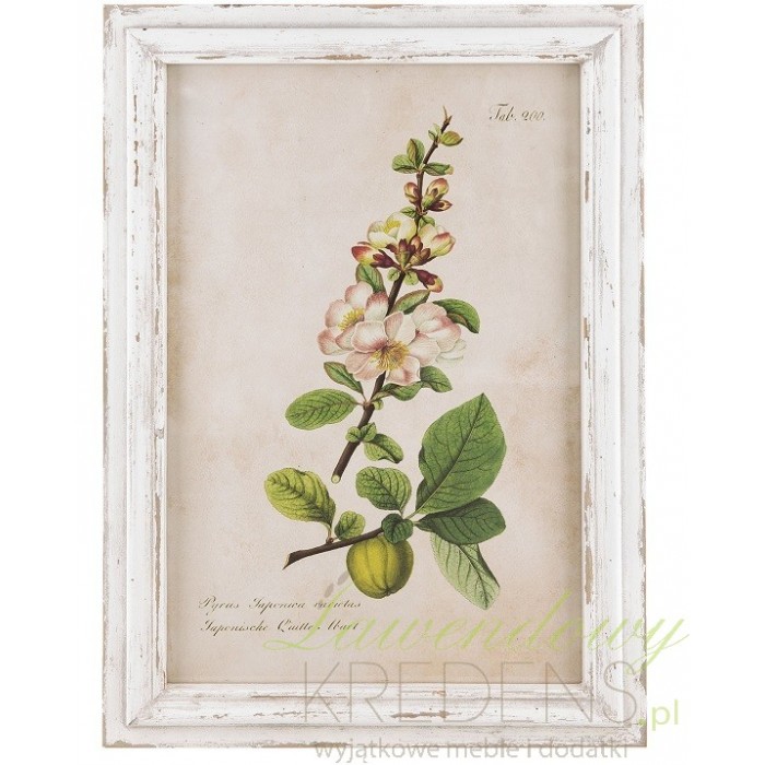 Obraz prowansalski przedstawia martwą naturę. Na postarzanym tle znajdują się dwie gałązki, jedna z owocem agrestu, a druga z kwiatem jabłoni. Obraz oprawiono w ramę w kolorze białym z przetarciami, przez co całe arcydzieło wygląda na stary obraz. Obrazy w stylu prowansalskim są doskonałe do wnętrz z duszą.