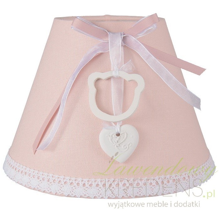 Śliczny abażur dziecięcy w stylu prowansalskim został wykonany z bawełny w różowym kolorze. Fantastycznie udekorowany misiem i serduszkiem w górnej części doskonale sprawdzi się we wszystkich dziewczęcych aranżacjach. Wykorzystaj różowy abażur prowansalski, który powstał z miłości do pięknych wnętrz i stwórz wymarzone oświetlenie w pokoju swojej pociechy. Abażury prowansalskie stanowią najpiękniejsze okrycie dla drewnianych i jasnych lamp.