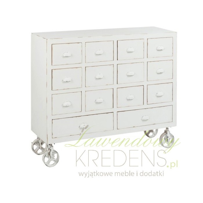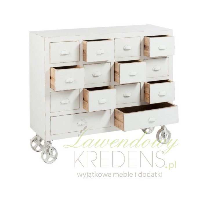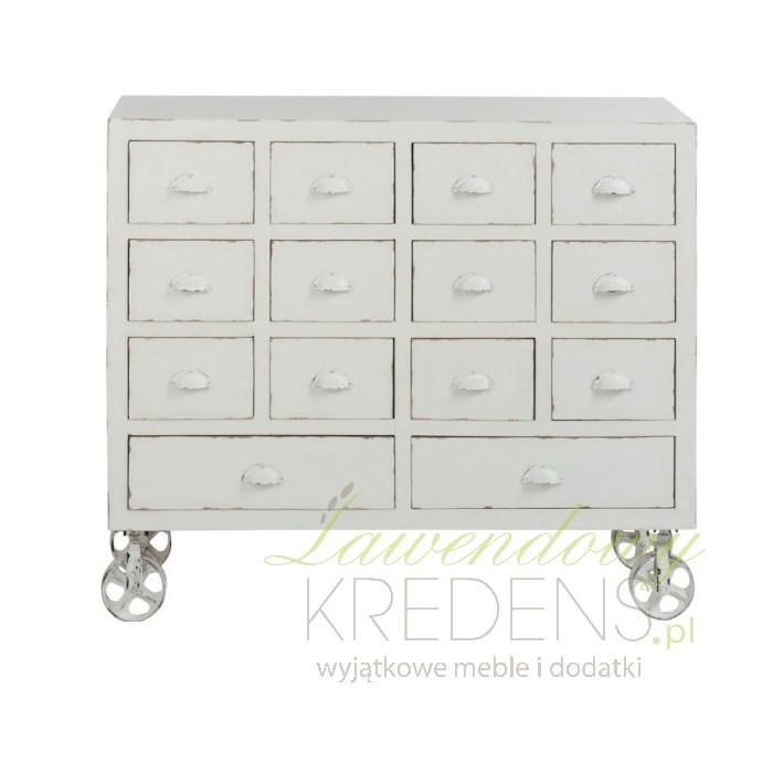 We współczesnych wnętrzach tradycyjne meble coraz częściej konkurują z meblami prowansalskimi. Przykładem takiego mebla jest komoda aptekarska, której wnętrze stanowi aż 14 szuflad! Dla zwiększenia funkcjonalności mebla komodę wyposażono w cztery kółka. Krawędzie komody w stylu aptekarskim oraz krawędzie szuflad, a także koła zostały poprzecierane aby mebel wyglądał na stary model.