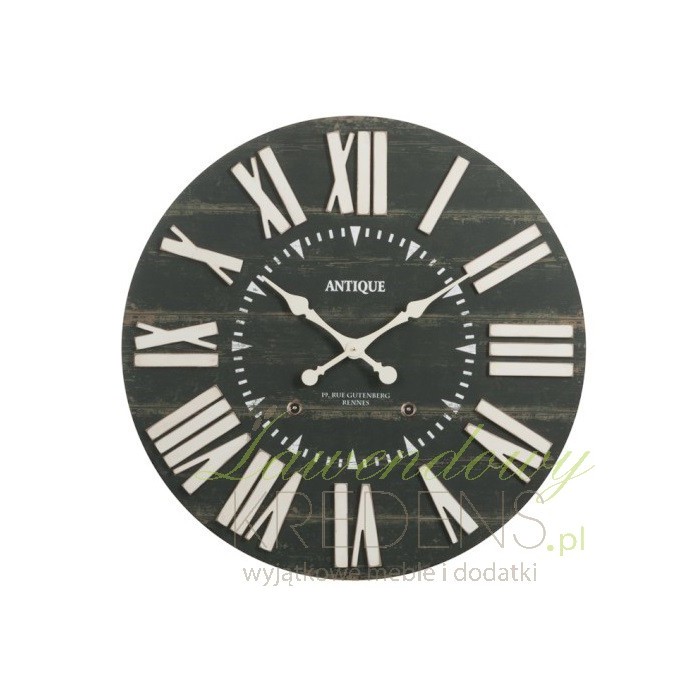 Drewniany zegar w stylu francuskim to detal do wyposażenia wnętrza o pokaźnej średnicy. Zawieś go na ścianie w reprezentatywnym wnętrzu takim jak salon lub duży przedpokój, by wszyscy goście razem z Tobą już od progu mogli poczuć się wyjątkowo. Ten czarny zegar nie da się nie zauważyć, przykuwa uwagę od razu dzięki antycznym przecierkom i jasnym cyfrom. Zegary scienne to podstawa dobrze funkcjonującego wnętrza.