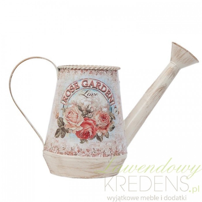 Ozdobna konewka prowansalska z różami i napisami Rose Garden. Będzie doskonałym dodatkiem do każdej romantycznej aranżacji. Jeśli Twemu wnętrzu, bądź w Twoim ogrodzie brakuje delikatności i uroku, to dodatki w stylu prowansalskim będą tam pasowaly idealnie. Biała konewka z różami została w całości wykonana z metalu.