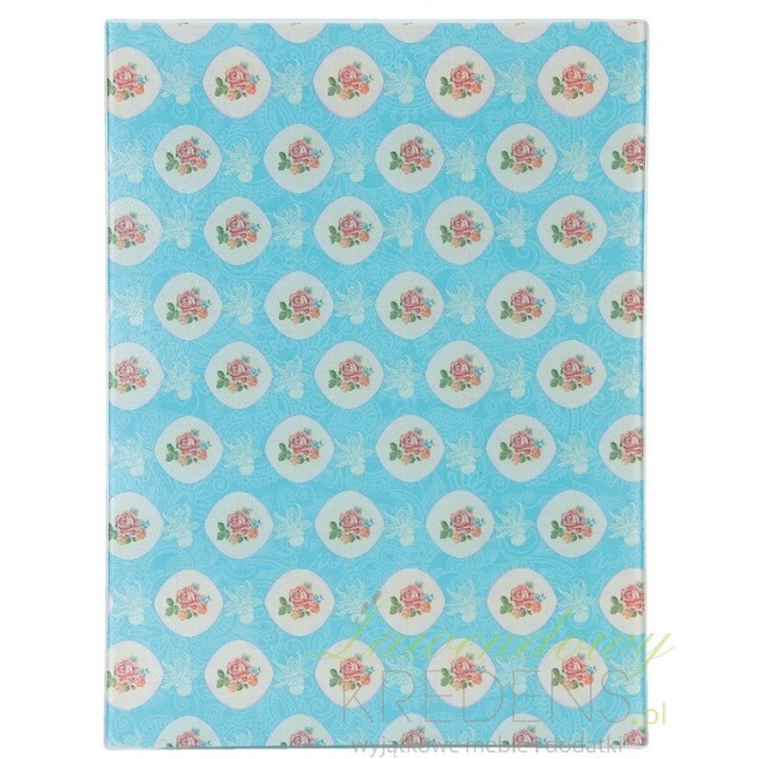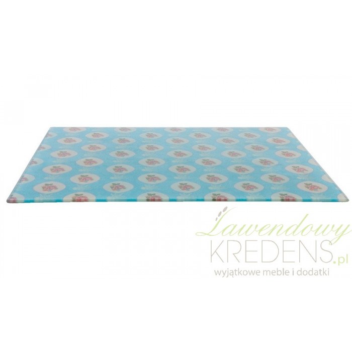 Deska do krojenia z kwiatami to prostokątna deska pokryta szkłem. Pod szklaną taflą znajduje się ozdobna grafika z reguralnym wzorem kwiatowych bukiecikó na błękitnym tle. Szklana deska w stylu retro może służyć także jako taca do serwowania koreczków. Wybierz dodatki retro od Clayre&Eef dla swojej kuchni.