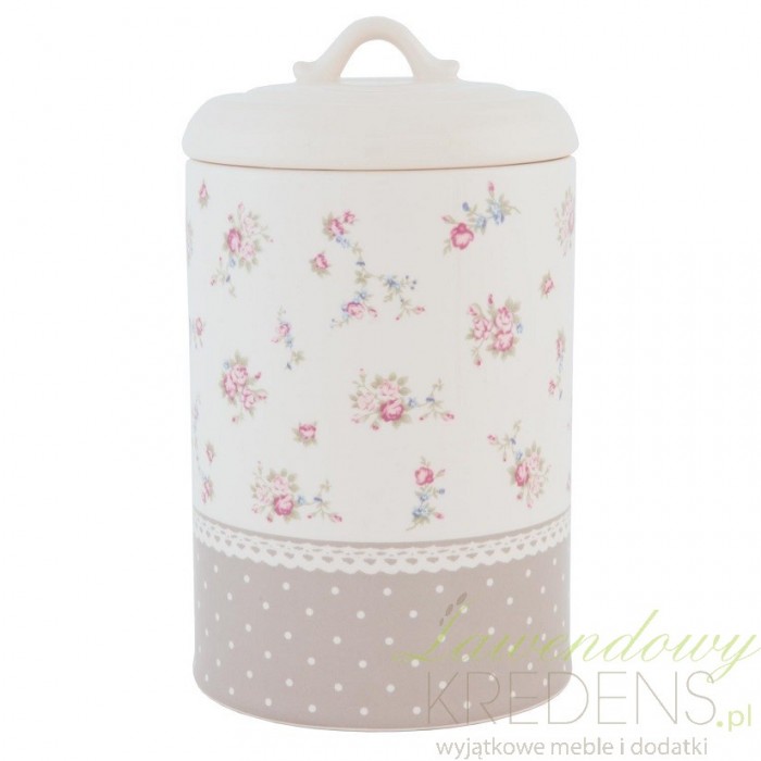 Ceramiczny pojemnik do kuchni z przykrywką ma mnóstwo zdobniczych wzorów takich jak koronka, kwiatuszki i białe groszki. Wszystkie wzory mimo że różnią się od siebie razem wyglądają spójnie. Pojemnik prowansalski z praktyczną przykrywką wykonano z ceramiki. Pamiętaj, że prowansalskie pojemniki kuchenne to niezastąpione elementy wyposażenia tego wnętrza.
