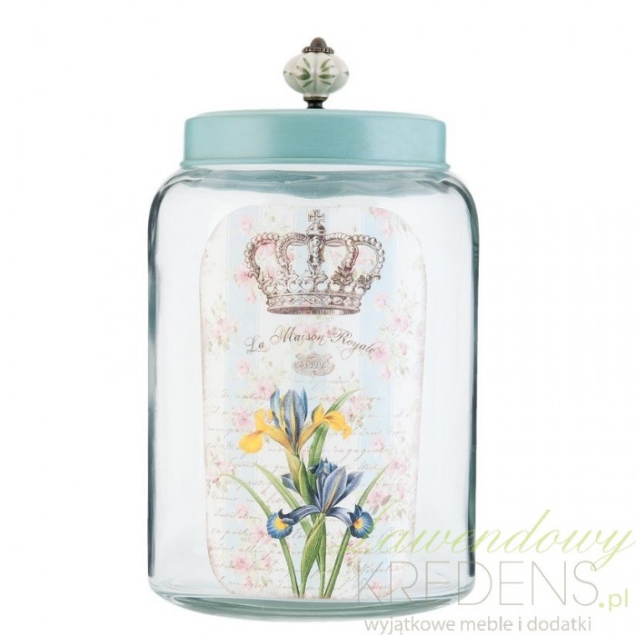 Duży słoik ozdobny to naczynie o pojemności 3,5 litra. Słoik wyróżnia się niezwykle zdobniczą formą o czym świadczy niebieska przykrywka i prostokątna naklejka z koroną i kwiatami. Słoik ozdobny doskonale sprawdzi się w kuchni lub jako dekoracja półki w salonie. Słoiki ozdobne to także praktyczne prowansalskie dekoracje, ponieważ umożliwiają bezpieczne przechowywanie sypkich produktów.