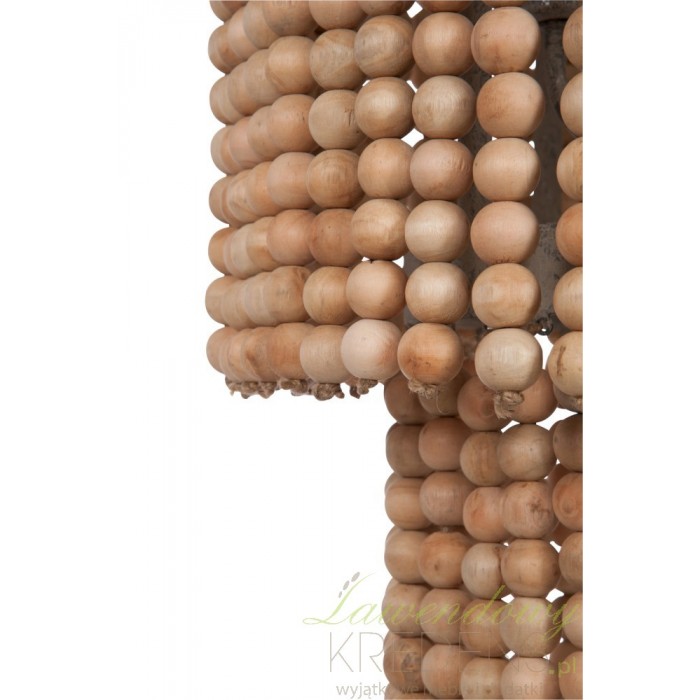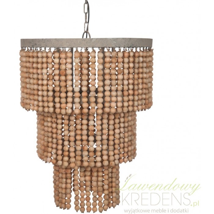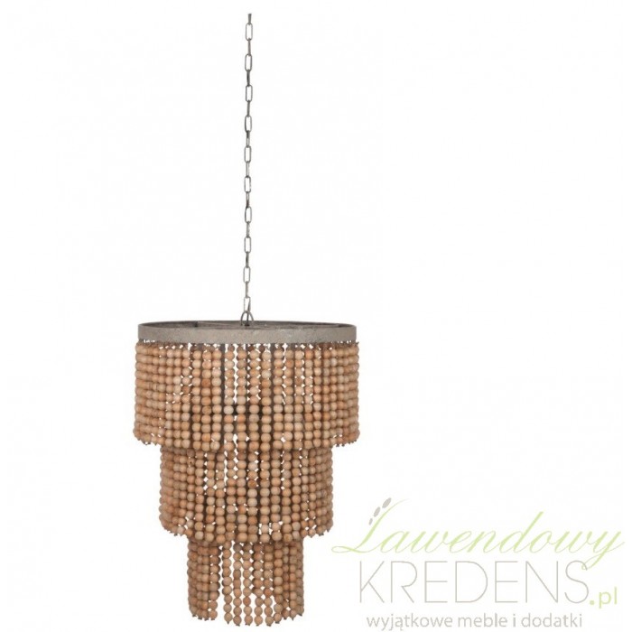Duży żyrandol z kulkami w stylu prowansalskim, którego klosz tworzą zwiąsajace na sznurkach drewniane kulki. Sznury koralików tworzą trzy poziomy i wyglądają niezwykle naturalnie dzięki słojom widocznym na każdej z kulek. Żyrandol z kulek zawieszony na łańcuchu przymocowanym do metalowego pierścienia podkreśli zalety wnętrz o ponadczasowej urodzie. Możliwość dowolnej regulacji wysokości i stworzenie przytulnego wnętrza zagwarantują Ci tylko postarzane żyrandole w stylu prowansalskim!