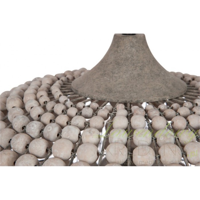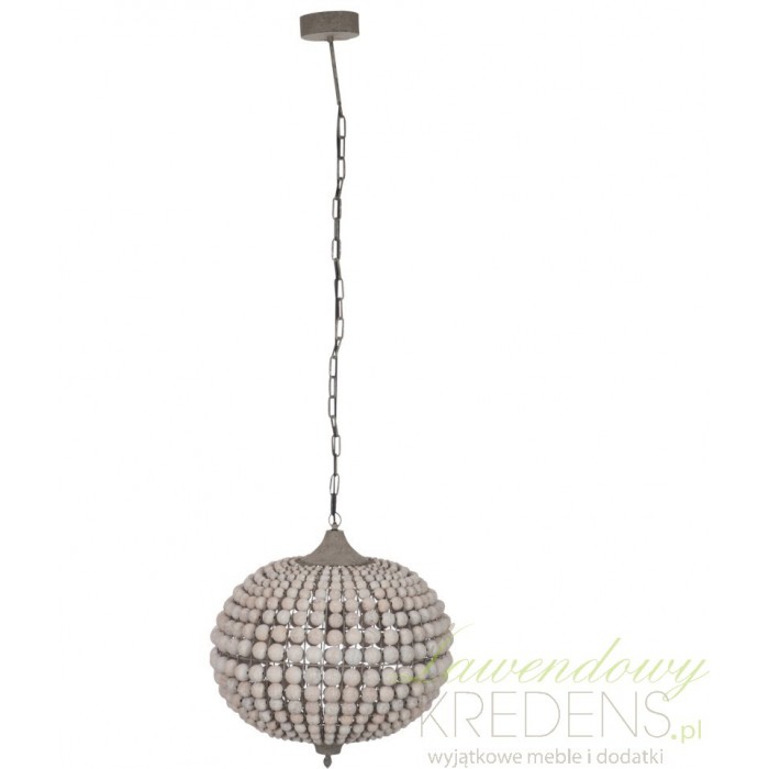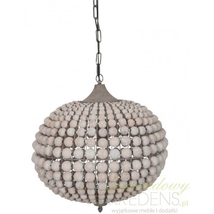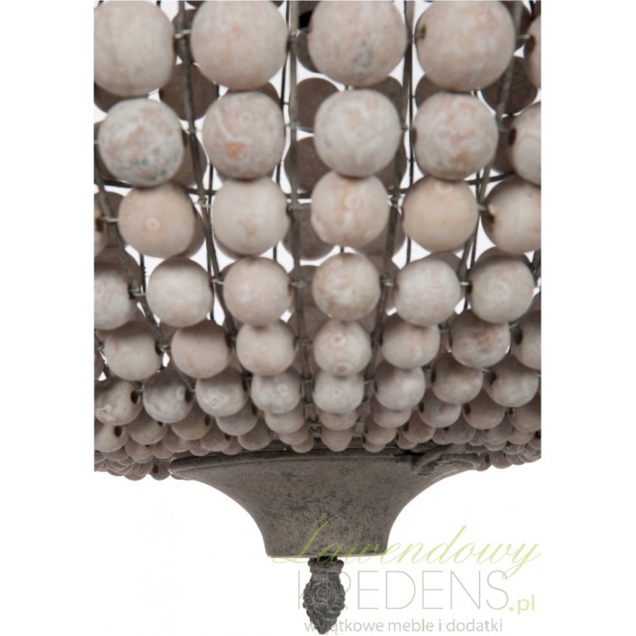 Duży żyrandol prowansalski wyróżnia piękny klosz wykonany z połączonych ze sobą drewnianych kulek. Żyrandol z kulek w kształcie kuli zawieszony jest na długim łańcuchu, co umożliwia dowolną regulacje jego wysokości i odpowiednie dostosowanie do wysokiego baru lub niskiego stolika. Wykorzystaj żyrandol z kulkami jako stylową formę oświetlenia w swoim domu, ponieważ takiego efektu nie zapewni Ci żadna inna lampa sufitowa. Wiszący żyrandol z postarzeniami to gwarantowane zadowolenie i satysfakcja przez długie lata!