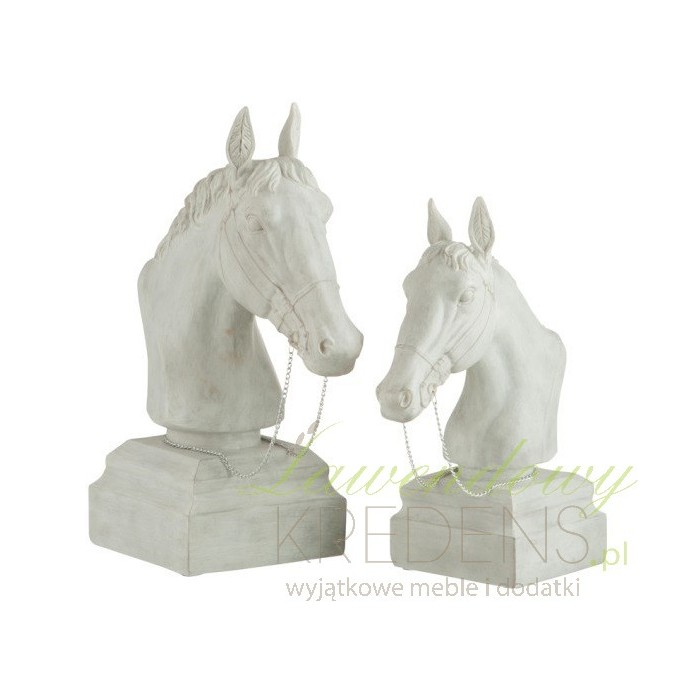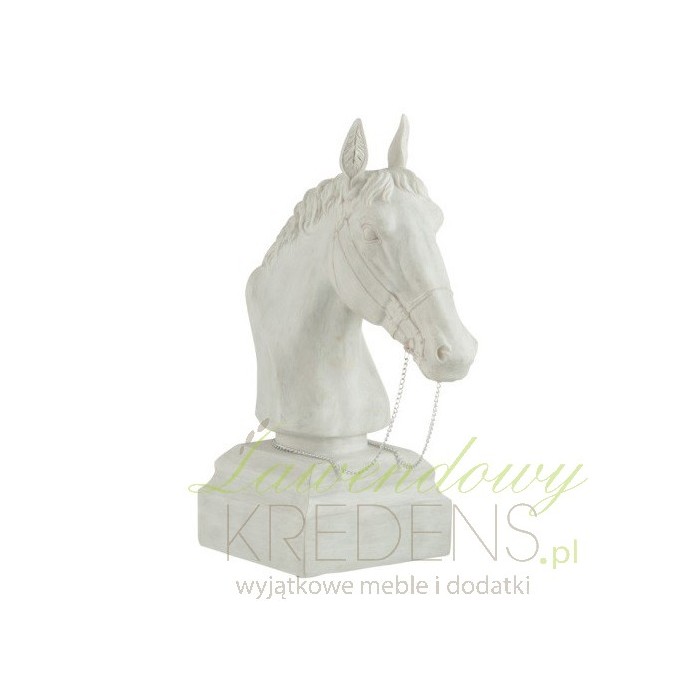 Figurka konia wykonana jest z wysokiej klasy tworzywa w kolorze antycznej bieli. Koń ozdobny ma duży rozmiar i stoi na kwadratowej wysokiej podstawie. Artykuły dekoracyjne w formie głowy konia to wspaniała dekoracja zarówno ogrodu, jak i domu.
