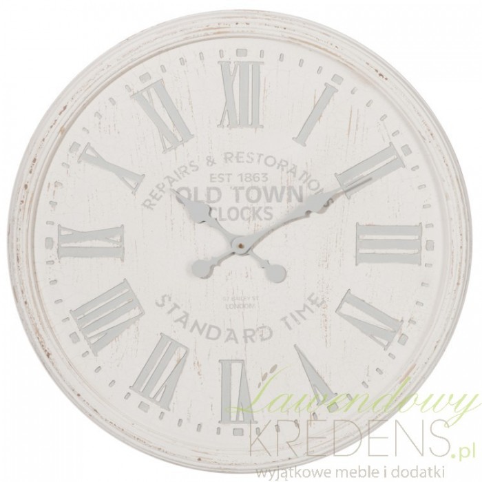 Zegar postarzany ma pokaźną średnicę sięgającą blisko 90 centymetrów. Duży zegar swój oryginalny design zawdzięcza przecieranej krawędzi i szarym napisom angielskim. Duże zegary ścienne to zdecydowany akcent na ścianę we wnętrzach nie tylko francuskich ale również tych urządzonych w nowoczesnym stylu. Jasnokolorowy zegar postarzany pięknie będzie wyglądał w połączeniu z szarą lub kolorową ścianą.