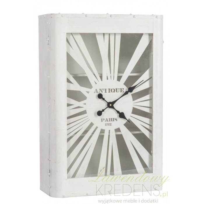 Metalowa szafka z zegarem wykonana jest w formie białego mebla do zawieszenia na ścianie. Szafka, na której drzwiach zamontowano zegar z napisami i czarnymi wskazówkami delikatnie odkrywa swoją zawartość poprzez ażurowe drzwi. Dwie półki wewnątrz szafki możesz wykorzystać dowolnie, ponieważ metalowa szafka sprawdzi się w każdym wnętrzu. Zapomnij o nieuporzadkowanych bibelotach i zdezorganizowanym wnętrzu! Zamów meble prowansalskie już teraz!