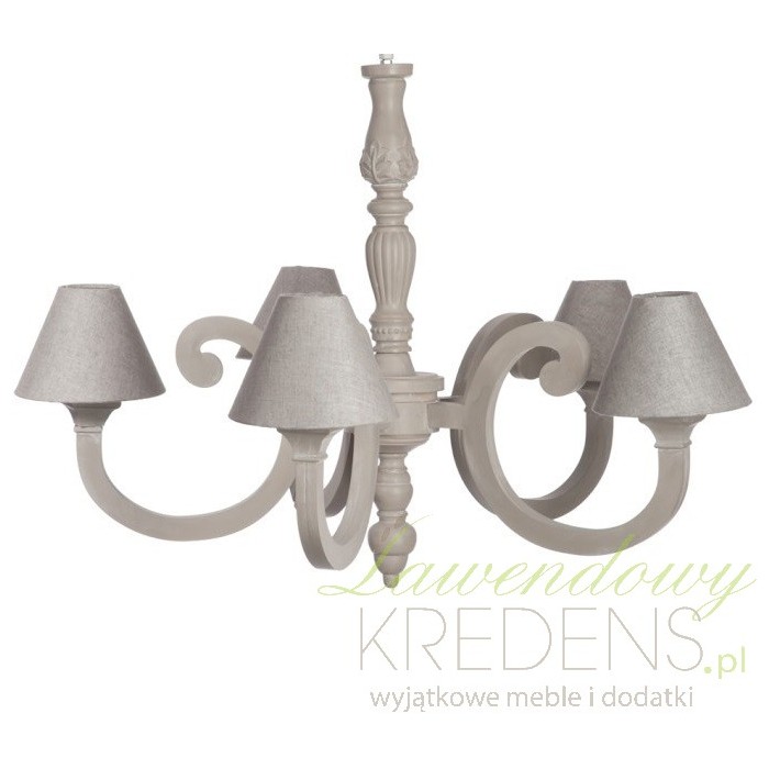 Pięcioramienny prowanslaski żyrandol z szarymi abażurami osadzonymi na gustownie rzeźbionych ramionach. Naturalność zamknięta w pięknym żyrandolu to sposób na urządzenie niepowtarzalnego wnętrza. Dbałość o wygląd salonu lub jadalni ułatwią Ci piękne żyrandole w stylu prowansalskim. Wyróżnij pomieszczenia, które reprezentują styl całego domu i wybierz niepowtarzalny drewniany żyrandol!