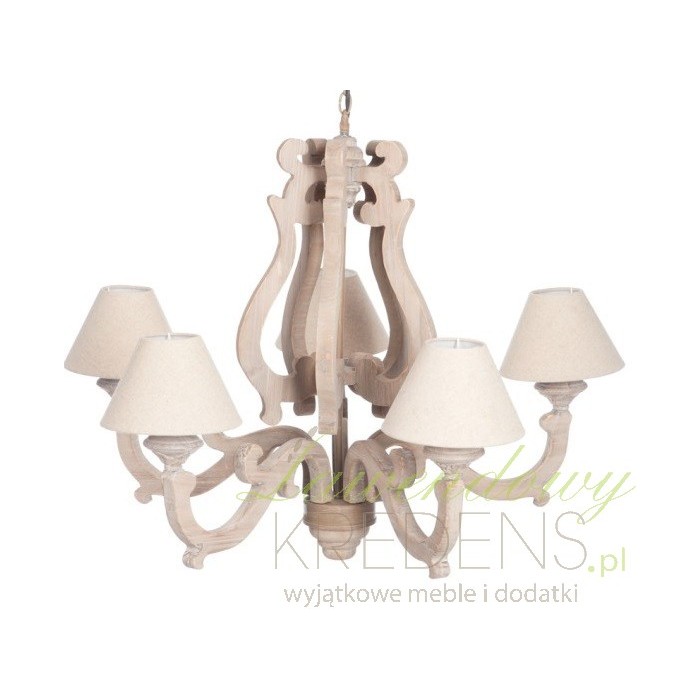 Utrzymany w jasnym kolorze drewniany żyrandol w stylu prowanslaskim został wykonany w odcieniu brązu. Widoczne miejscami i słoje i bielenia odpowiadają na wszystkie potrzeby francuskich i skandynawskich aranżacji. Dzięki dbałości o każdy szczegół i piękny kształt prowansalski żyrandol z drewna to doskonały detal oświetlający salon lub duży pokój. Żyrandole w stylu prowanslaksim to gwarancja ciekawej aranżacji sufitu.