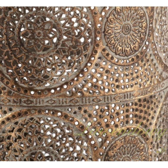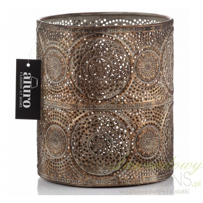 Lampion Aluro posiada przepiękny i niepowtarzalny wzór w koła z przecieraną gdzieniegdzie farbą. Świecznik Aluro wykonany jest z metalu i ma złoty kolor. Ma okrągły kształt a włożona do środka świeczka roztaczać będzie wokół siebie pozytywną energię. Produkty Aluro to godne polecenia, wysokiej klasy dodatki d wnętrz.