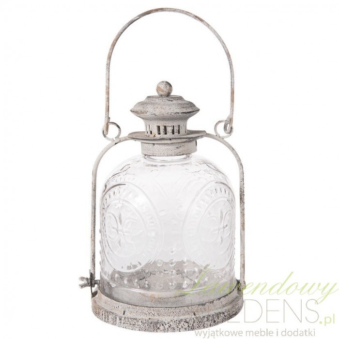 Szklany lampion na tealight w kształcie latarenki z pomocniczą rączką. Metalowy uchwyt wykańczający metalowy stelaż utrzymuje szklane naczynie z zagadkowym rzeźbieniem. Umieść wewnątrz lampionu z postarzeniami świeczkę i mianuj swój salon najbardziej przyjaznym miejscem w całym domu. Dodatki w stylu prowansalskim nigdy Cię nie zawiodą!