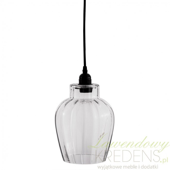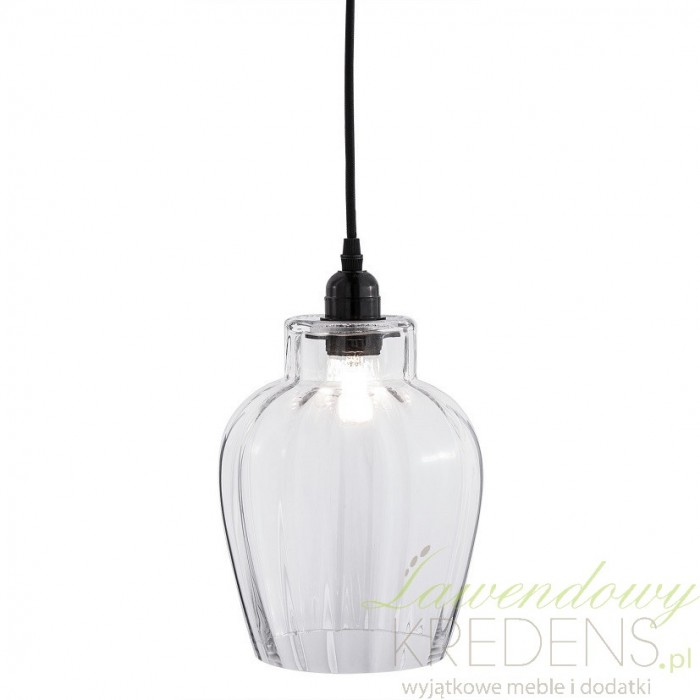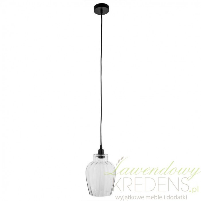 Oryginalna, szklana lampa o kształcie przypominającym kwiat tulipana od razu wpada w oko. Zamocowany na czarnym kablu przeźroczysty klosz ma widoczne prążki, dzięki którym światło równomiernie rozprowadzi się po całym wnętrzu. Szklane lampy doskonale sprawdzą się jako oświetlenie wnętrz o zmiennych właściwościach powietrza, szczególnie takich jak wilgotne łazienki i zaparowane kuchnie.